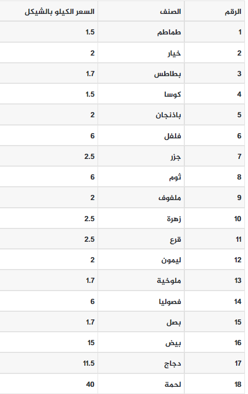 جاءت أسعار الخضروات والدجاج واللحوم في قطاع غزة اليوم الخميس، كما يلي: