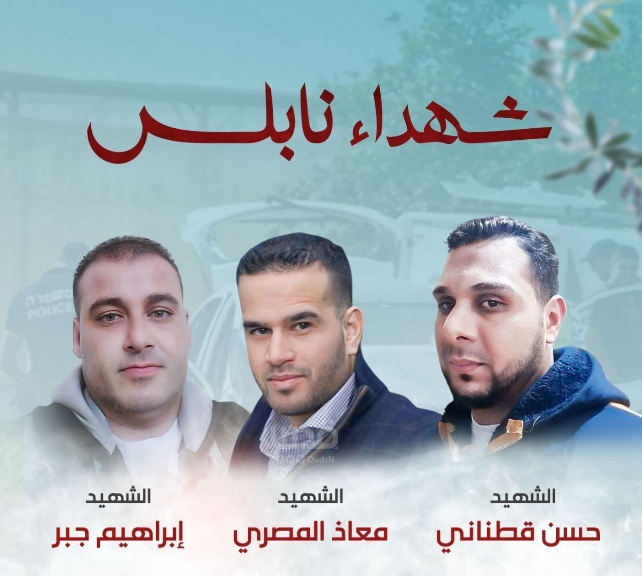 نعت حركة فتح بساحة غزة، شهداء نابلس الأبطال، الذين أستشهدوا اليوم الخميس، في عملية اغتيال جابنة نفذها جيش الاحتلال القاتل ووحداته الخاصة التي اقتحمت منطقة الياسمينة بالبلدة القديمة بنابلس، والشهداء هم حسن سليمان حسن قطناني (35 عاما) ومعاذ سعد نبيه مصري (35 عاما) وإبراهيم أحمد محمد جوري (جبر) (45 عاما).