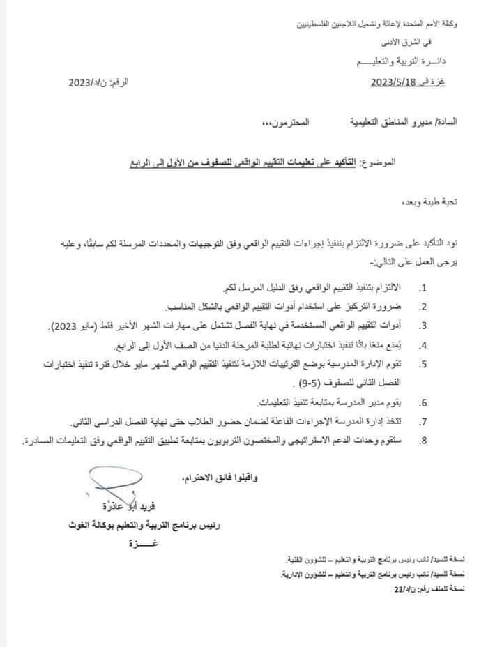 أصدرت مديرية التربية والتعليم بوكالة "الأونروا " في غزة ، اليوم الخميس 18 مايو 2023، تعميمًا إلى مديري المناطق التعليمية بخصوص التأكيد على تعليمات التقييم الواقعي للصفوف من الأول إلى الرابع الابتدائي.
