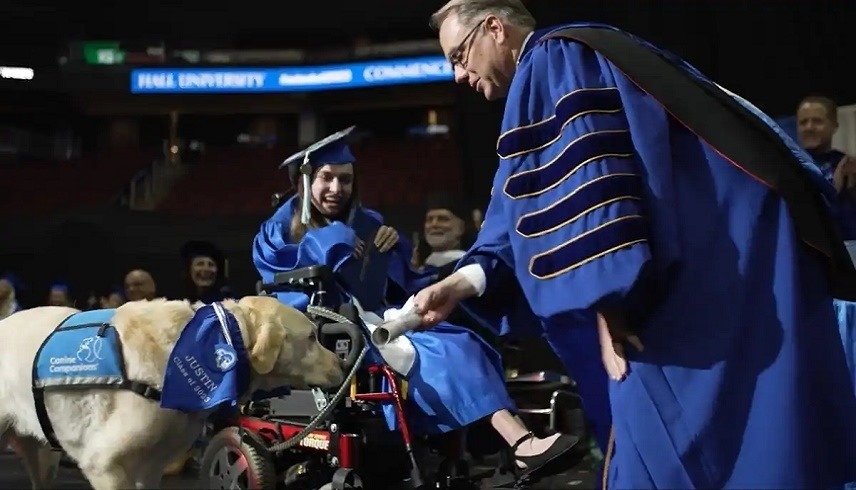 سرق كلب يُدعى جاستن الأضواء في حفل التخرج بجامعة سيتون هول في نيوجيرسي بحصوله على دبلومة على خشبة المسرح.