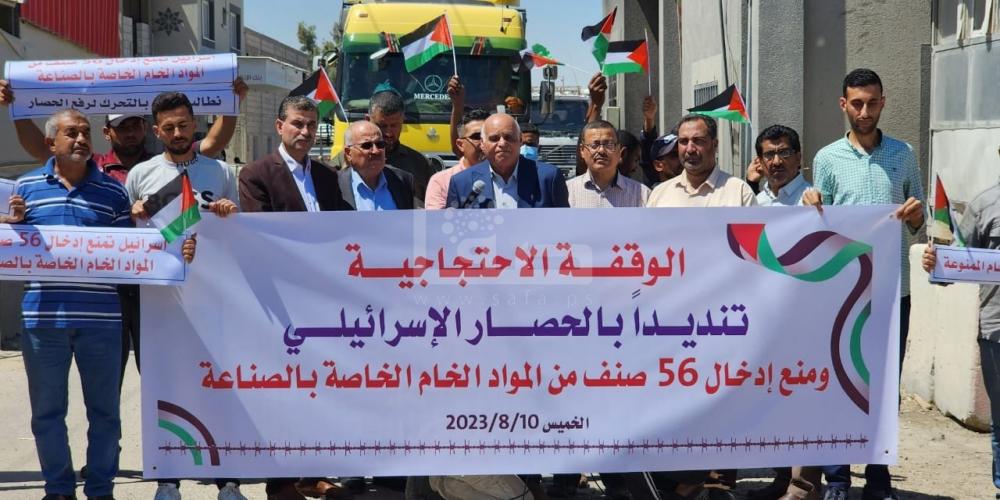 نظَّم الاتحاد العام للصناعات الفلسطينية، اليوم الخميس، وقفةً احتجاجية أمام بوابة معبر كرم أبو سالم جنوب قطاع غزّة، احتجاجاً على الحصار "الإسرائيلي" ومنع إدخال 56 صنفاً من المواد الخام الخاصة بالصناعة.