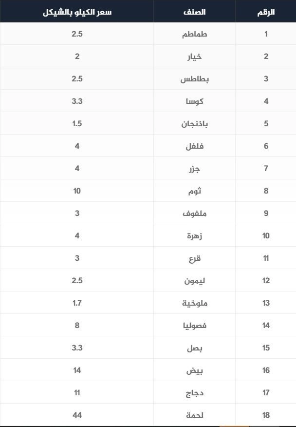 جاءت أسعار المنتجات الغذائية "الخضروات والفواكه والدجاج واللحوم" في أسواق قطاع غزة، صباح اليوم السبت 23 سبتمبر 2023، على النحو التالي: