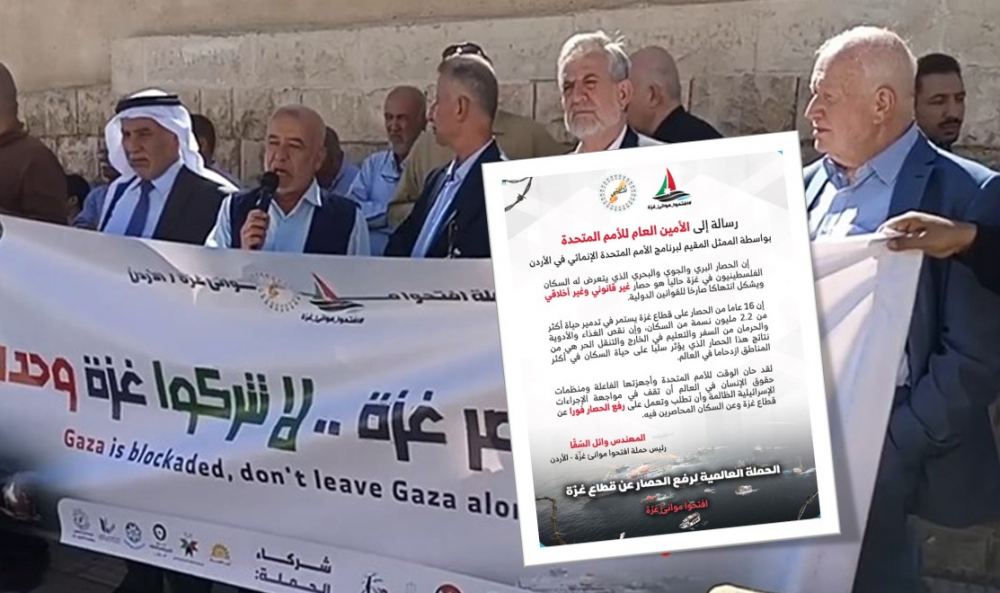 احتشد عشرات الأردنيين أمام مكتب الأمم المتحدة في عمان، مساء الثلاثاء، في وقفة تضامنية مع المحاصرين في قطاع غزة، ولتسليم مكتب الأمم المتحدة عريضة تطالب بالعمل على فك الحصار الإسرائيلي عن موانئ غزة.