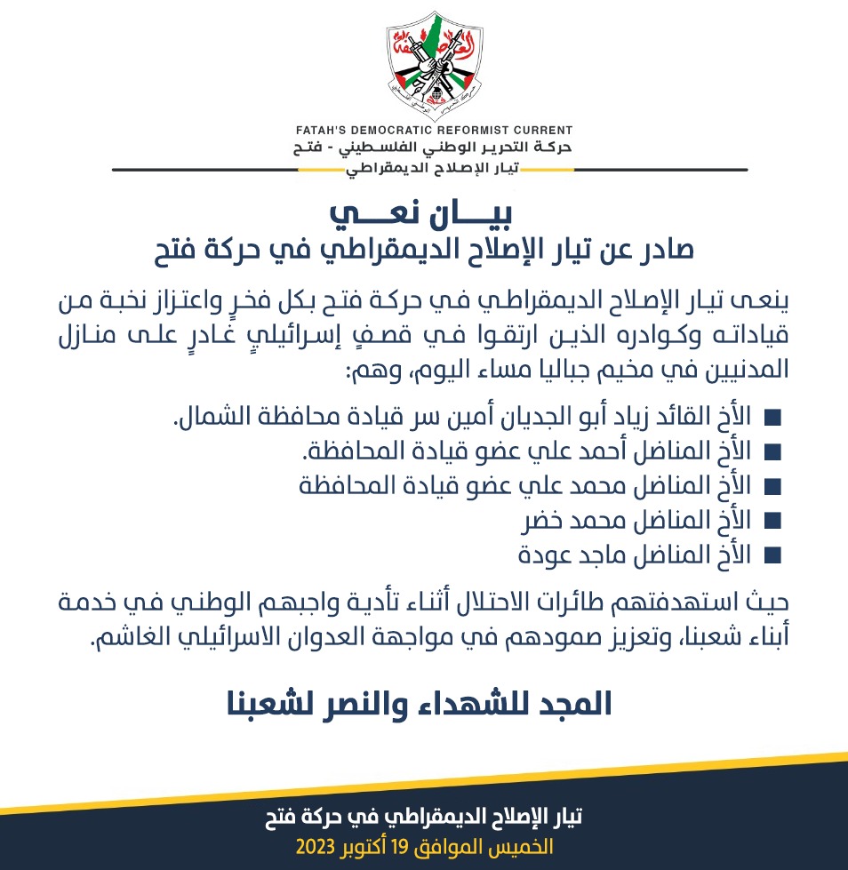 نعى تيار الإصلاح الديمقراطي في حركة فتح بكل فخرٍ واعتزاز نخبة من قياداته وكوادره الذين ارتقوا في قصفٍ إسرائيليٍ غادرٍ على منازل المدنيين في مخيم جباليا مساء أمس الخميس، وهم: