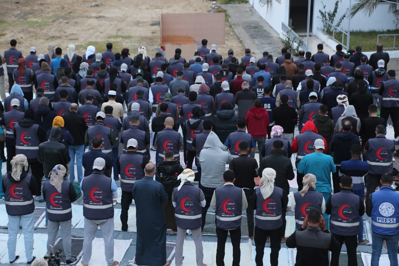 البعثة الإماراتية ومتطوعو عملية الفارس الشهم 3 يؤدون صلاة عيد الفطر في قطاع غزة، أدت بعثة دولة الإمارات العربية المتحدة في قطاع غزة ومتطوعو عملية الفارس الشهم 3، صلاة عيد الفطر السعيد في مقر إقامتهم بالمستشفى الميداني الإماراتي جنوب القطاع، حيث شارك الأطباء وكافة المتطوعين الغزيين في شعائر العيد المبارك، تضامناً مع سكان قطاع غزة وتجسيداً لروح الأخوة في ظل الأوضاع الكارثية التي يعاني منها السكان.