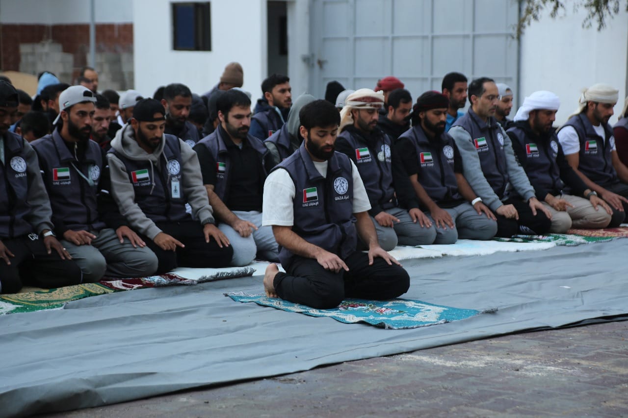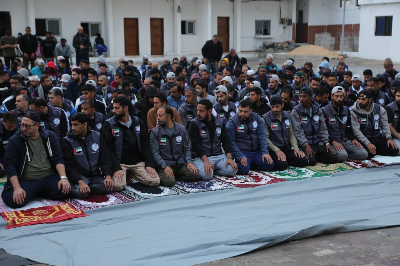بالصور: البعثة الإماراتية ومتطوعو عملية الفارس الشهم 3 يؤدون صلاة عيد الفطر في قطاع غزة