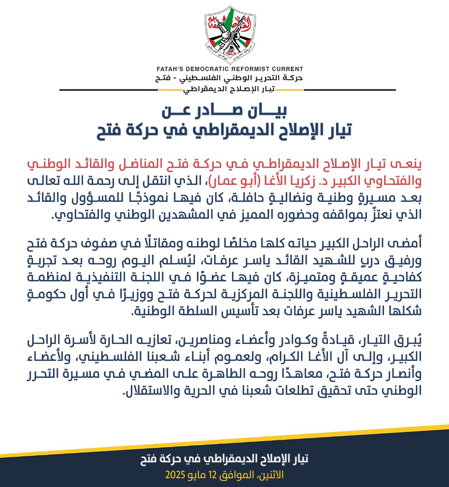 نعى تيار الإصلاح الديمقراطي في حركة فتح المناضل والقائد الوطني والفتحاوي الكبير د. زكريا الأغا (أبو عمار)، الذي انتقل إلى رحمة الله تعالى بعد مسيرةٍ وطنية ونضاليةٍ حافلة، كان فيها نموذجًا للمسؤول والقائد الذي نعتزّ بمواقفه وحضوره المميز في المشهدين الوطني والفتحاوي.