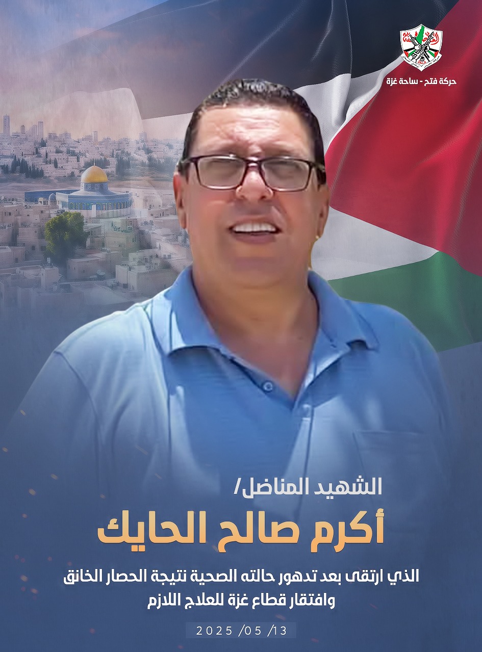 نعى تيار الإصلاح الديمقراطي في حركة فتح - ساحة غزة الشهيد المناضل والقيادي الفتحاوي أكرم الحايك (أبو صالح)، أحد كوادر حركة فتح ومناضليها الأحرار وأحد كوادر التيار المتقدمين في ساحة غزة، الذي انتقل إلى رحمة الله تعالى بعد مسيرةٍ وطنيةٍ ونضاليةٍ وسيرةٍ عطرة، كان فيها على الدوام ملتصقًا بهموم الوطن والمواطن، وحاضرًا في المواقف التي يُمتحن فيها الرجال.