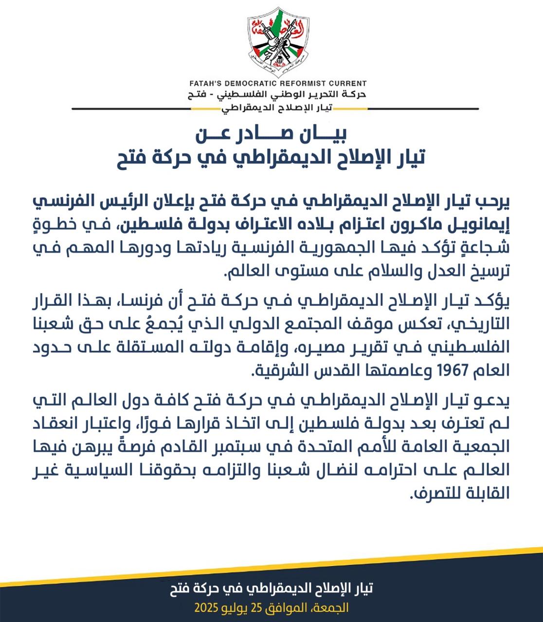 رحب تيار الإصلاح الديمقراطي في حركة فتح بإعلان الرئيس الفرنسي إيمانويل ماكرون اعتزام بلاده الاعتراف بدولة فلسطين، في خطوةٍ شجاعةٍ تؤكد فيها الجمهورية الفرنسية ريادتها ودورها المهم في ترسيخ العدل والسلام على مستوى العالم.