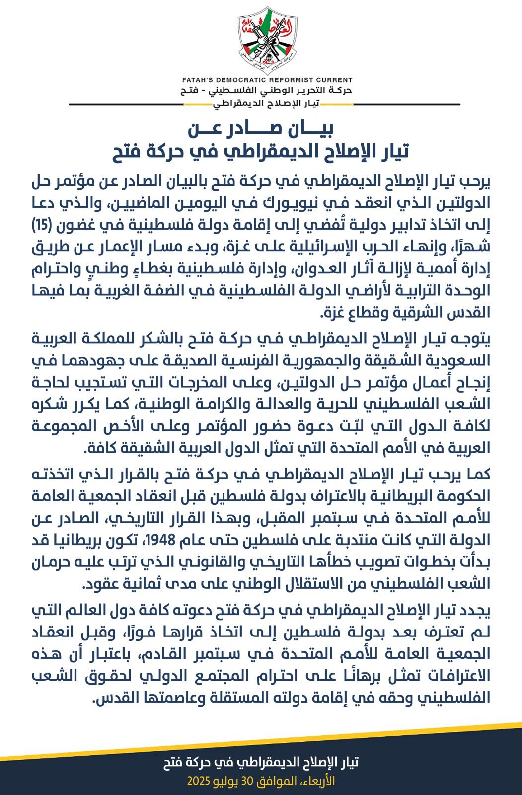 يرحب تيار الإصلاح الديمقراطي في حركة فتح بالبيان الصادر عن مؤتمر حل الدولتين الذي انعقد في نيويورك في اليومين الماضيين، والذي دعا إلى اتخاذ تدابير دولية تُفضي إلى إقامة دولة فلسطينية في غضون (15) شهرًا، وإنهاء الحرب الإسرائيلية على غزة، وبدء مسار الإعمار عن طريق إدارة أممية لإزالة آثار العدوان، وإدارة فلسطينية بغطاءٍ وطنيٍ واحترام الوحدة الترابية لأراضي الدولة الفلسطينية في الضفة الغربية بما فيها القدس الشرقية وقطاع غزة.