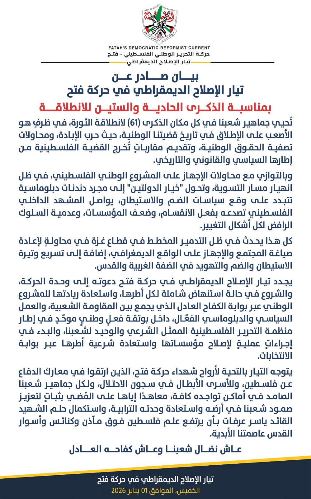 أكد تيار الإصلاح الديمقراطي في حركة فتح في بيانَه الصادر بمناسبة الذكرى الحادية والستين لانطلاقة الثورة الفلسطينية على أن هذه الذكرى تحلّ في الظرف الأصعب على الإطلاق في تاريخ القضية الوطنية، في ظل حرب الإبادة، ومحاولات تصفية الحقوق الوطنية، وطرح مقاربات تُخرج القضية الفلسطينية من إطارها السياسي والقانوني والتاريخي.