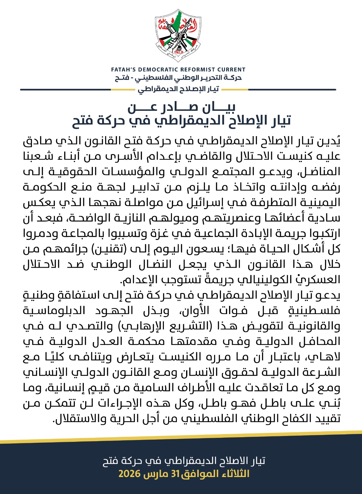 أدان تيار الإصلاح الديمقراطي في حركة فتح القانون الذي صادق عليه كنيست الاحتلال والقاضي بإعدام الأسرى من أبناء شعبنا المناضل.