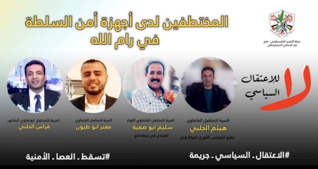 واستنكر نواب من حركة فتح بالمجلس التشريعي على قيام أمن السلطة في الضفة الغربية بحملة اعتقالات واستدعاء للمناضلين وأعضاء وقيادات من حركة فتح استمراراً لسياسة تكميم الأفواه، ومحاربة أصحاب الرأي و الكلمة وتصفية الحسابات والتضيق على حرية الرأي والتعبير، وأن أبناء فتح أنفسهم ثمن الهوان السياسي والفشل في إدارة الأزمات الوطنية.