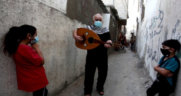 توفيق شناعة يعزف على العود لأداء أغاني فلسطينية تقليدية في مخيم رفح في مدينة رفح جنوب قطاع غزة وهو يرتدي الكمامة الطبية