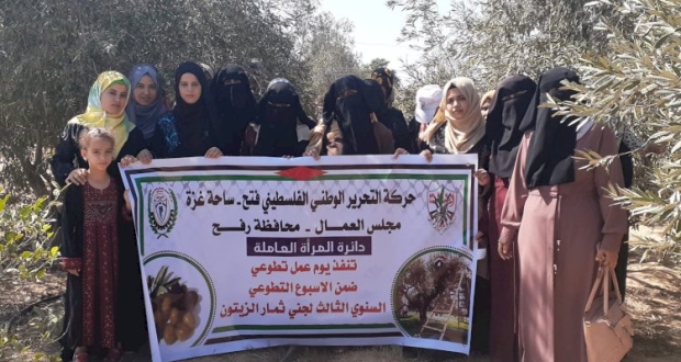 شاركت دائرة المرأة العاملة في مجلس العمال برفح في اليوم التطوعي ضمن الاسبوع التطوعي السنوي الثالث لجني ثمار الزيتون.