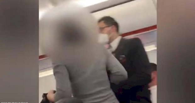ويرصد الفيديو، الذي صوره راكب آخر في رحلة طيران على متن "إيزي جيت" يوم الأحد، وكانت متجهة من بلفاست بأيرلندا الشمالية إلى إدنبرة في اسكتلندا، المرأة وهي تفقد أعصابها، بعدما اقترب منها مضيف طيران لإنزالها من الطائرة.