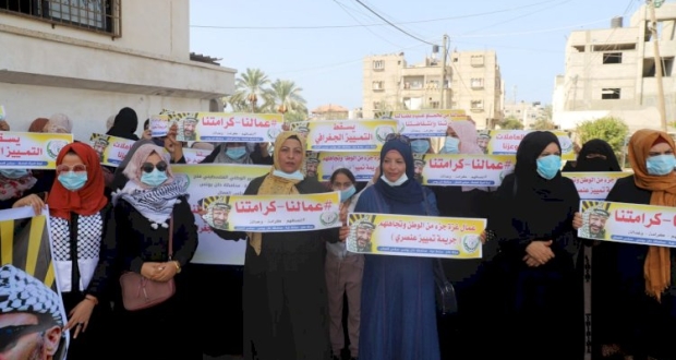 نظمت لجنة المرأة العاملة بمجلس العمال في محافظة خان يونس، وقفة احتجاجية بسبب التمييز الجغرافي الذي تمارسه حكومة رام الله مع عمال و عاملات قطاع غزة.
