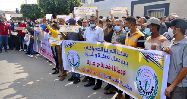 نظم مجلس النقابات العمالية في محافظة غزة اليوم وقفة احتجاجية رفضاً لسياسة سلطة رام الله التي تنتهجها من تمييز عنصري وجغرافي بين عمال الضفة وعمال غزة أمام مكتب وزارة العمل غرب مدينة غزة.