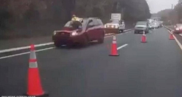 وتستمر السيارة في الحركة مسرعة لأمتار عدة قبل أن يتم توقيفها من عامل آخر، ثم ينزل الرجل الذي اعتلاها، وقد شوهد وهو يعرج بينما كان يمشي على جانب الطريق السريع.