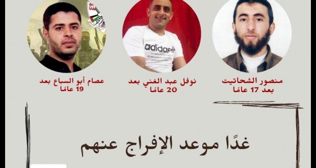 قال نادي الأسير، إن يوم غدٍ الخميس موعد الإفراج عن ثلاثة أسرى بعد أن أمضوا سنوات في سجون الاحتلال وهم: منصور الشحاتيت من الخليل، ونوفل عبد الغني من طولكرم، وعصام محمد أبو السباع من مخيم جنين.