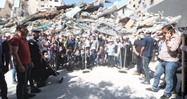 — #GAZA Fatehmedia (@fatehmediaa) May 23, 2021ومن جهته، قال صلاح العويصي أمين سر هيئة العمل التنظيمي بحركة فتح ساحة غزة، أن الشباب الفلسطيني جاء اليوم من كل المحافظات ليعلنوا تضامنهم الكامل مع أصحاب الأبراج المدمرة.