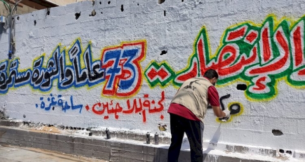 أحيت لجنة المؤسسات والمجتمع المدني ..لجنة اللاجئين ذكرى النكبة 73 في جميع مخيمات قطاع غزة برسم جداريات مركزية في مخيمات العزة والصمود .