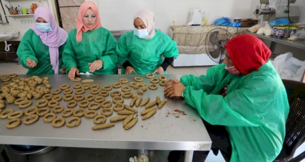 بالقرب من الشارع الذي تقع فيه جمعية "بنت الريف"، في بيت لاهيا شمال قطاع غزة، تشدك رائحة الكعك ومعمول العيد، حيث تعمل 35 سيدة كخلية نحل بلا كلل ولا ملل، تم اختيارهن بعناية فائقة، للوصول إلى أكثر فئات المجتمع تهميشاً لمساعدتهن في كسب لقمة العيش لاعالة أسرهن.