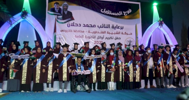 -حركة الشبيبة الفتحاوية في محافظة خانيونس تنظم حفلًا لتكريم متفوقي طلبة الثانوية العامة برعاية النائب محمد دحلان.