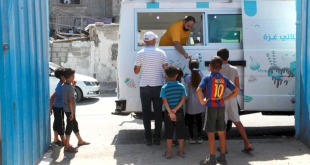 وسط أزقة مخيم البريج، يلتف عشرات الأطفال حول باص (جيلاتي غزة) الذي يوزع المثلجات مجاناً، في ظل ارتفاع درجات الحرارة في قطاع غزة.