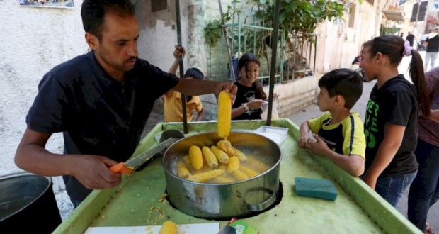 يجوب مهران حمادة 39 عاماً شوارع مخيم بلاطة للاجئين من الساعة التاسعة صباحاً وحتى الثانية عشرة ليلاً " يتلقط" رزقه وقوت أولاده، ويقصده الجميع لتذوق طعم الذرة المسلوقة التي يصنعها بيديه على "نار الحطب" فيضيف إليها نكهة الحامض والملح ليعتدل طعمها المحبب للصغار والكبار.