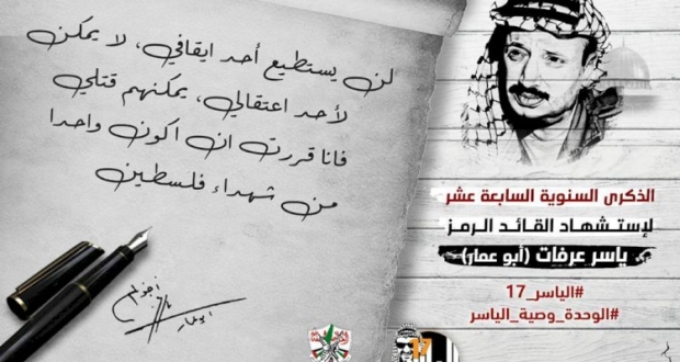 يُحيي الفلسطينيون، الخميس، الذكرى الـ 17 لرحيل الزعيم ياسر عرفات، الذي توفي في 11 نوفمبر/ تشرين الثاني 2004 عن عمر ناهز 75 عاما، في مستشفى “كلامار” العسكري بالعاصمة الفرنسية باريس.