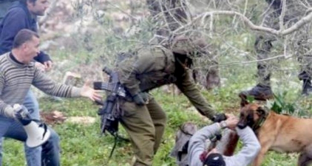 صورة- كلبًا ينهش شابًا فلسطينيًا خلال اعتقاله من قبل جيش الاحتلال
