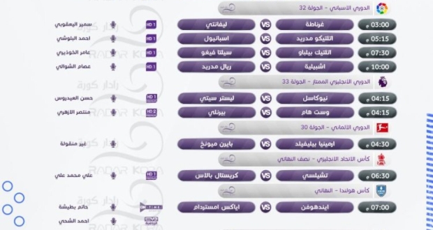 ويتقابل في نصف نهائي كأس الإتحاد الإنجليزي تشيلسي مع كريستال بالاس، أما في أبرز مباريات الأسبوع 33 من الدوري الإنجليزي فيلعب مباريات نيوكاسل يونايتد مع ليستر سيتي، أما في الدوري الإسباني يتواجه إشبيلية مع ريال مدريد، وأتلتيكو مدريد مع إسبانيول بالمرحلة 32، وفي ألمانيا يتواجه أرمينيا بيليفيلد مع بايرن ميونيخ ضمن مباريات الأسبوع 30، ويلعب في قمة المرحلة 32 من الدوري الفرنسي باريس سان جيرمان مع ملرسيليا.