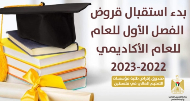 أعلن صندوق إقراض طلبة مؤسسات التعليم العالي في فلسطين، اليوم الثلاثاء بدء استقبال طلبات الحصول على قروض دراسية للفصل الأول من العام الدراسي 2022-2023، لطلبة البكالوريوس والدبلوم المتوسط في مؤسسات التعليم العالي الفلسطينية.