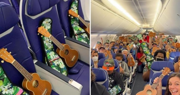 ليس كل يوم تصعد على متن رحلة لتجد جيتارًا على مقعدك وشخص مستعد لإعطائك دروسًا فى الجو، لكن هذا بالضبط ما حدث لأولئك الذين كانوا على متن خطوط ساوث ويست إيرلاينز الأمريكية، مع انتشار المفاجأة الغريبة بعد أن شاركتها شركة الطيران في تغريدة، حيث شاركت شركة الطيران صورة لطائرة مليئة بالركاب المبتسمين الذين كانوا متجهين من لونج بيتش، كاليفورنيا، إلى هاواى، حاملين القيثارة المجانية التى وجدوها على مقعدهم مع حقيبة زهرية.