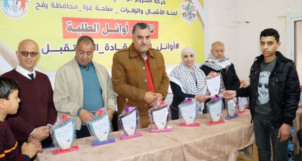 كرمت لجنة الأشبال والزهرات بحركة فتح في محافظة رفح، صباح اليوم السبت، الطلبة المتفوقين للفصل الدراسي الأول في المدارس الحكومية والوكالة والخاصة بالمحافظة.
