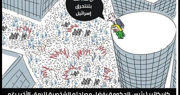 وجسدت الصحيفة نتنياهو وزوجته سارة فوق مبنى ويطلان برأسيهما على المتظاهرين في شوارع إسرائيل، وهو يقول: "إن شاء الله بتنحرق إسرائيل".
