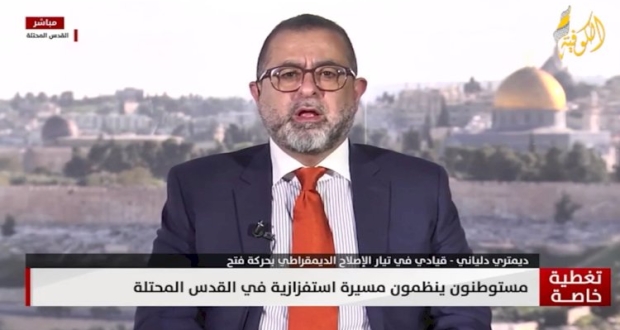 أصدر ديمتري دلياني، عضو المجلس الثوري والمتحدث باسم تيار الإصلاح الديمقراطي في حركة فتح، تصريح صحفي اليوم الأحد حول نصب الاحتلال الإسرائيلي لأعلامه على سطح وجدران المسجد الإبراهيمي الشريف.