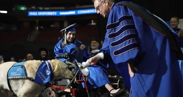 سرق كلب يُدعى جاستن الأضواء في حفل التخرج بجامعة سيتون هول في نيوجيرسي بحصوله على دبلومة على خشبة المسرح.