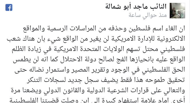 أبو شمالة: قرار الخارجية الأمريكية بحذف إسم فلسطين "لن يطمس الحق الفلسطيني"