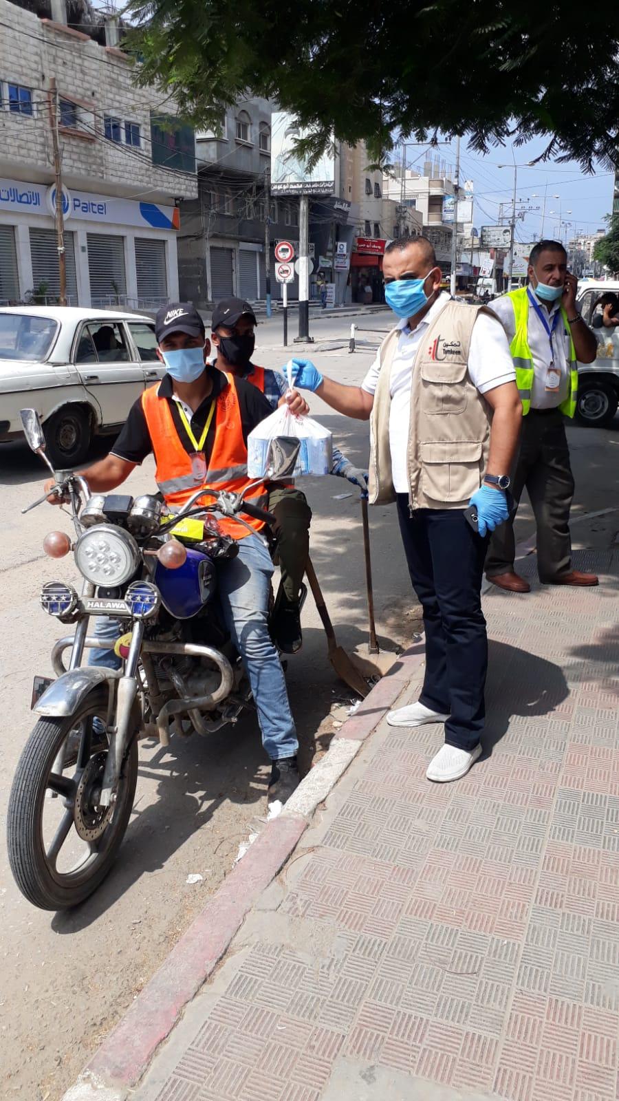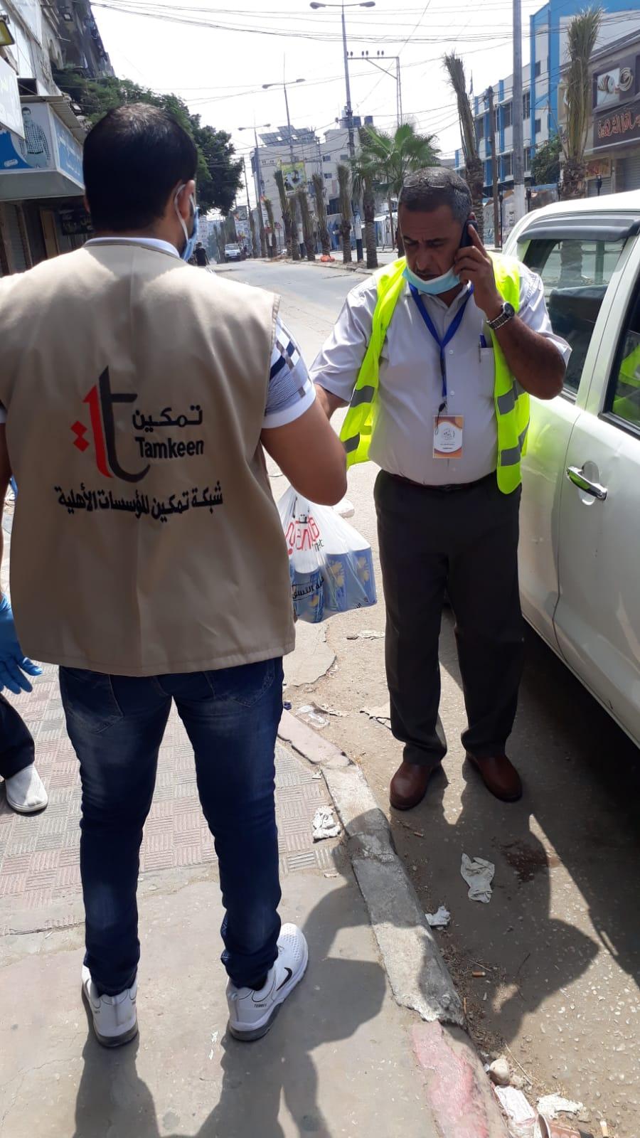 وزعت شبكة تمكين المؤسسات الاهلية ، اليوم الاثنين، طرود مشروبات على العاملين في المخيمات من عمال البلديات وموظفين شركة الكهرباء في ظل جائحة كورونا والتي تجتاح قطاع غزة من اكثر من اسبوع.