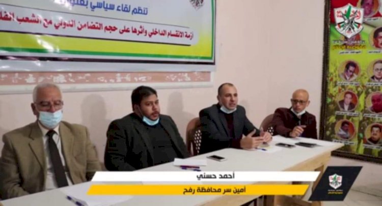 لجنة العلاقات الدولية بحركة فتح في محافظة رفح تنظم لقاء سياسي بعنوان أزمة الانقسام على حجم التضامن الدولي مع الشعب الفلسطيني