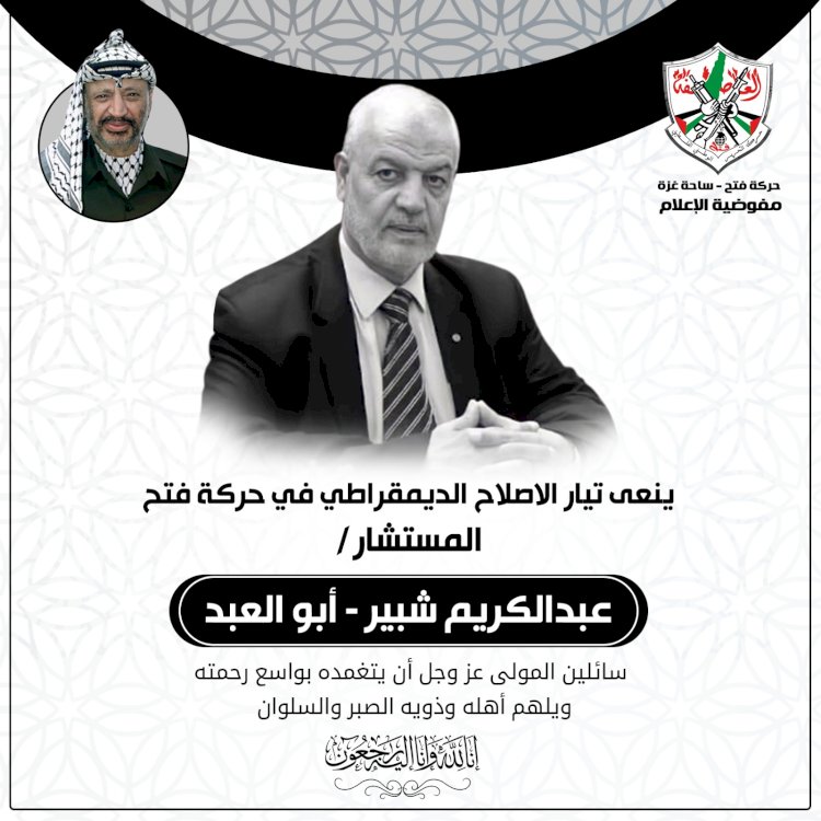 تتقدمت حركة التحرير الوطني الفلسطيني فتح – ساحة غزة، بأحر التعازي لجماهير شعبنا برحيل المستشار الدكتور عبد الكريم شبير "أبو العبد"، القامة العلمية والحجة القانونية والحضور الوطني والاجتماعي، الرجل العظيم الذي ترجم مشاعره الوطنية وعاطفته تجاه شعبه في محموعة مراجع قانونية صورت فاشية الاحتلال وقراراته العسكرية الظالمة في ثلاثةٍ وعشرين مجلداً، ستبقى وثائق شاهدة على جرائم الاحتلال الصهيوني، ودليل على سمو الشعور بالمسؤولية الوطنية.