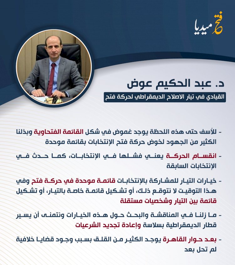 عبد الحكيم عوض: غموض في شكل القائمة الفتحاوية وبذلنا الكثير من الجهود لخوض الانتخابات بقائمة موحدة