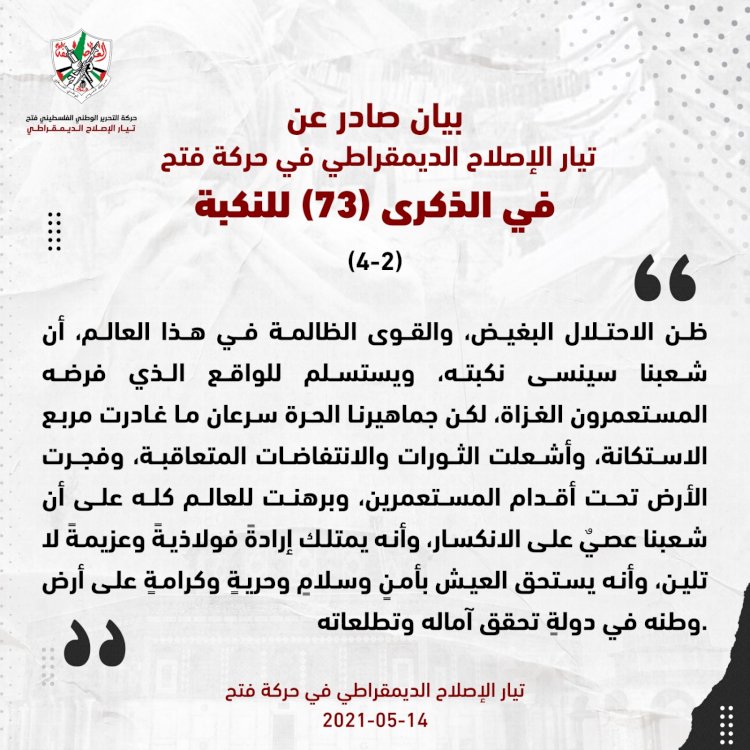 انفو: تيار الإصلاح الديمقراطي يصدر بيان في ذكرى النكبة بالتزامن مع الاعتداءات الإسرائيلية