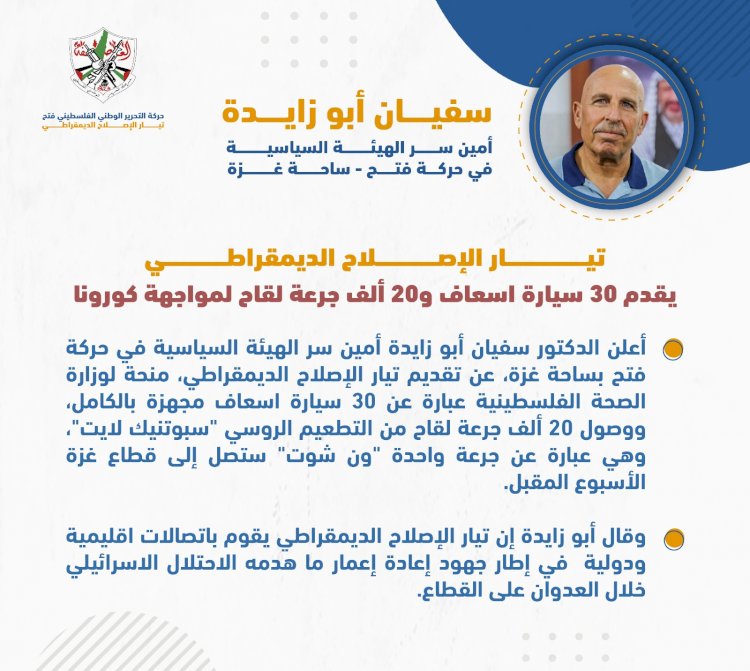 سفيان أبو زايدة: تيار الإصلاح الديمقراطي يقدم 30 سيارة إسعاف و20 ألف جرعة لقاح لوزارة الصحة