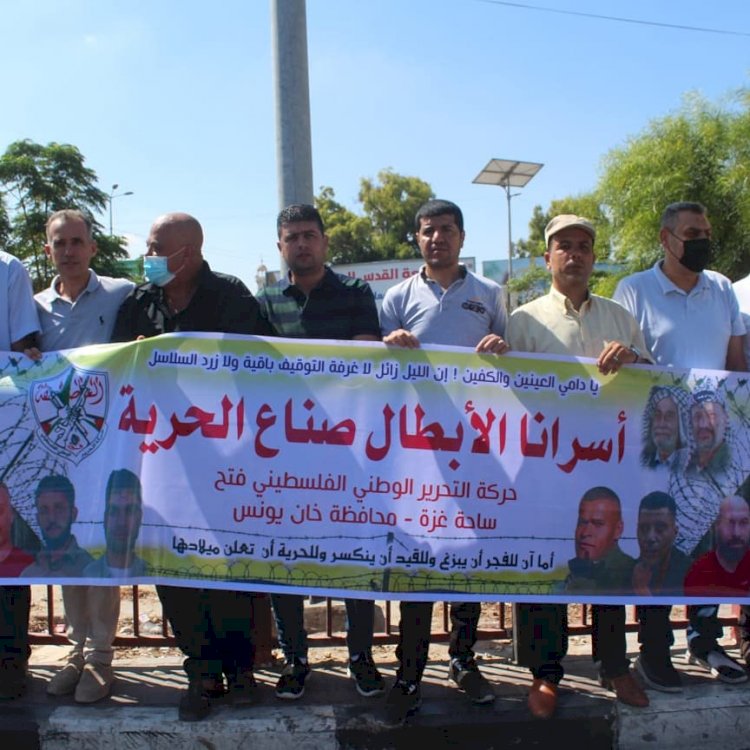 حركة فتح بساحة غزة في محافظة خانيونس تنفذ وقفة تضامنية مع أسرى الحرية بسجون الاحتلال في ظل ما يتعرضون له من اجراءات تعسفية وقمعية بحقهم.
