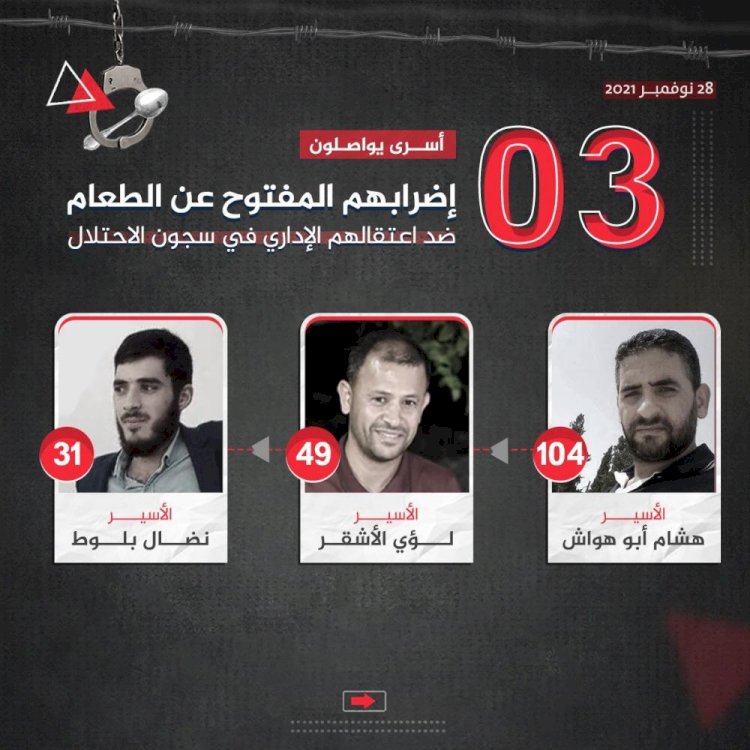 والأسرى المضربون هم: هشام أبو هواش منذ (104 أيام)، لؤي الأشقر مضرب منذ (49 يومًا)، ونضال مازن بلوط مضرب منذ (31 يومًا).