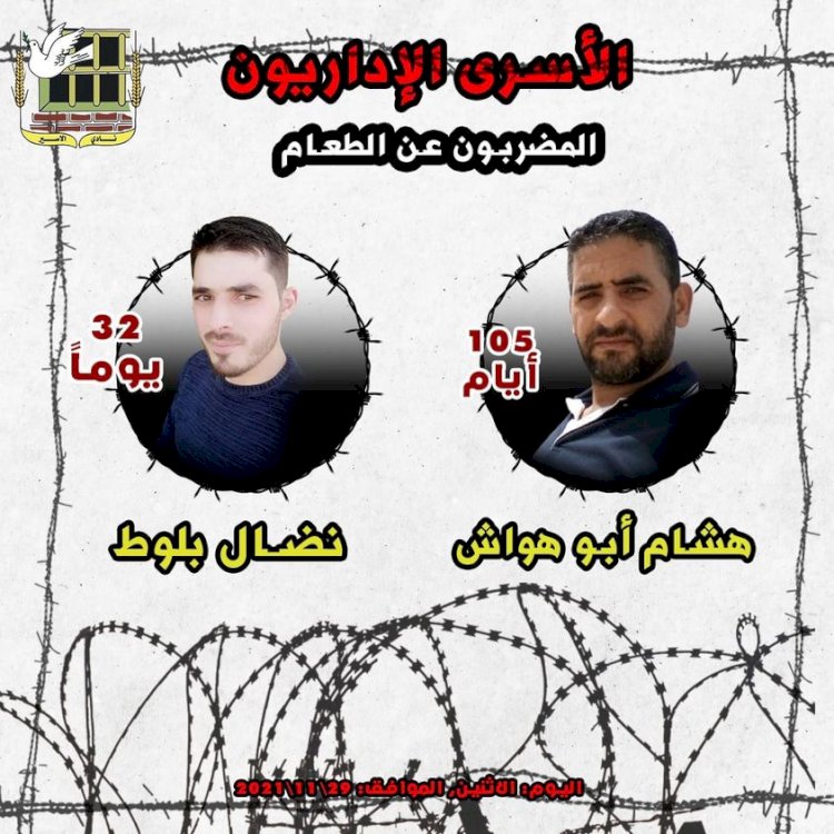 يواصل المعتقلان هشام أبو هواش ونضال بلوط إضرابهما عن الطعام رفضًا لاعتقالهما إداريًا.