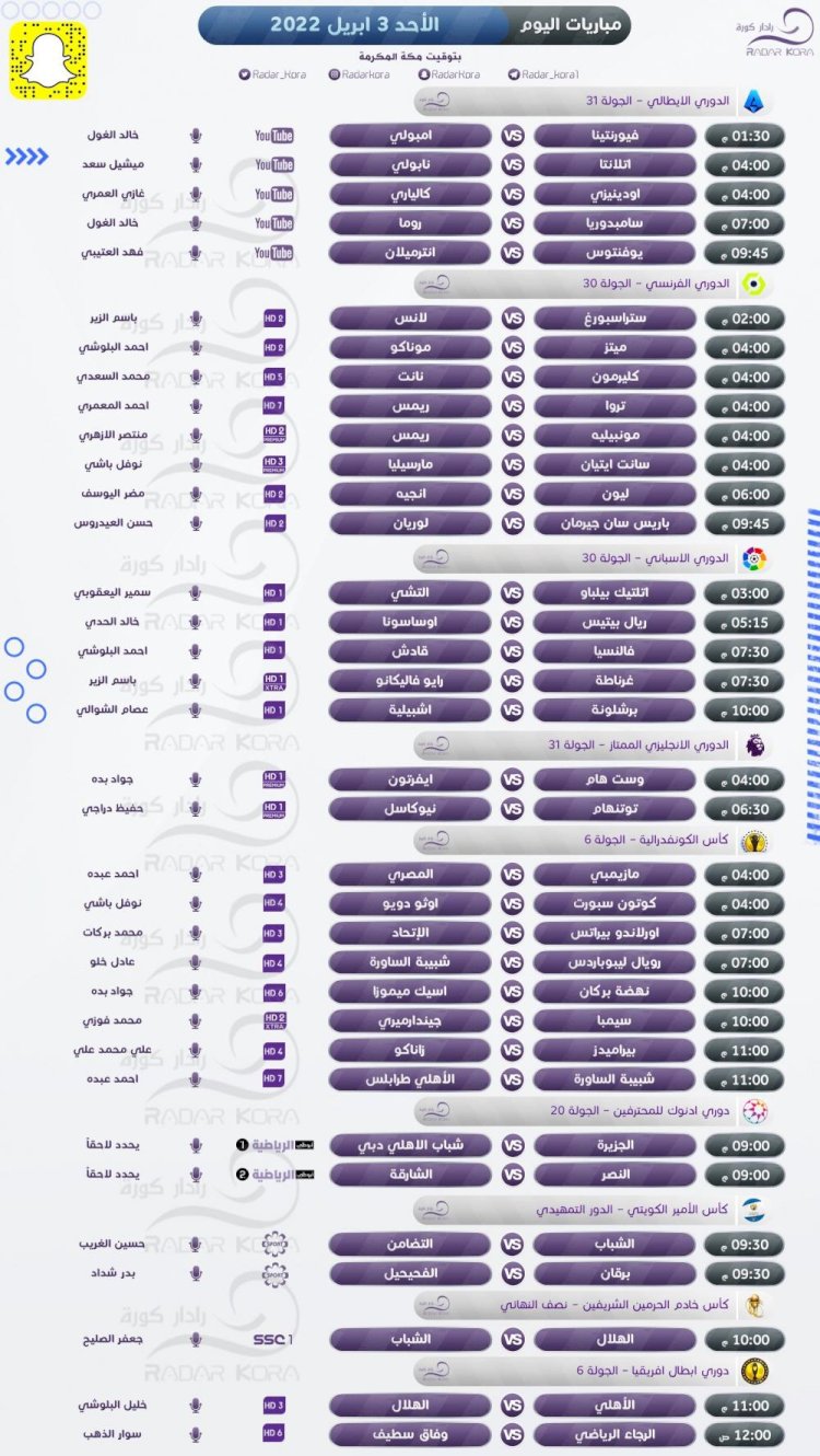 تتجه أنظار عشاق كرة القدم اليوم الأحد لعدة مباريات في الدوريات الأوروبية، وأبطال إفريقيا، والكونفدرالية الإفريقية.